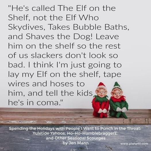 He’s called The Elf on the Shelf, not the Elf who Skydives, Takes Bubble Baths and Shaves the Dog! Leave him on the shelf so the rest of us slackers don’t look so bad. I think I’m just going to lay my Elf on his shelf, tape wires and hoses to him and tell my kids he’s in a coma and hopefully he’ll recover before Christmas. That should give me some flexibility.